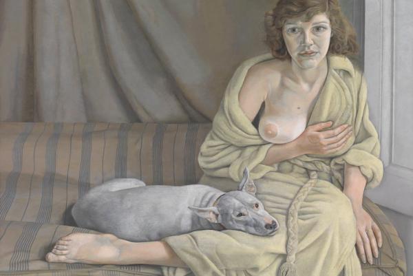 В основном Люсьен Фрейд все же предпочитал писать тех, кого знал близко. Подолгу работая над каждым портретом (тщательная, скрупулезная работа над картиной вообще была присуща художникам «Лондонской школы»), Фрейд подолгу рассматривал своих моделей, добиваясь невероятного психологизма, что снискало ему славу «Энгра экзистенциализма». Представленная на выставке картина «Девушка с белой собакой» — портрет первой жены художника Китти Гарман, выполненный им незадолго до их расставания. Модель с ее задумчивым, застывшим взглядом кажется отстраненной, но вместе с тем безропотной. Столь же послушной выглядит и фигура собаки — в живописи традиционный символ верности и покорности.