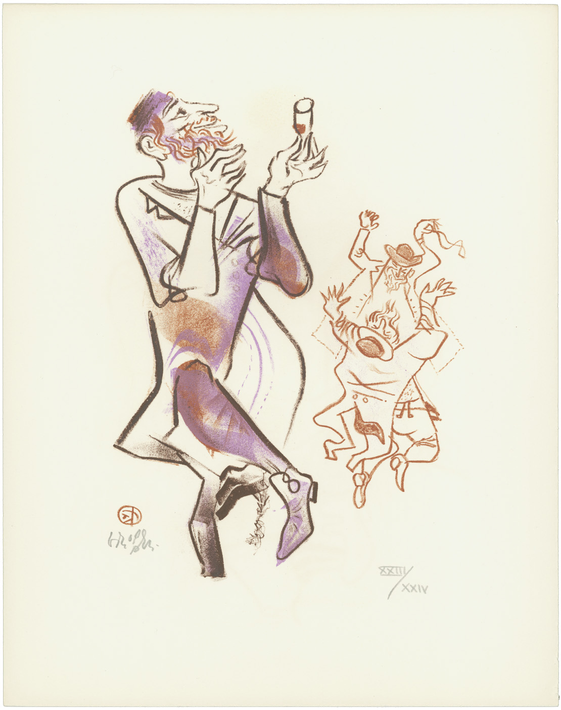 Однако по мере работы над витражами, с Гроппером произошло нечто, что заставляет нас задуматься. Престарелый художник неожиданно вспоминает о своих корнях. Нет, конечно, он прекрасно помнил, что он еврей. В годы войны на какое-то время это стало главной причиной его ненависти к Гитлеру, что вылилось в большое количество антифашистских карикатур. Но никогда еврейство не было для Гроппера доминирующим фактором. Он свято верил в коммунистическую идею, а еврейство считал чем-то вроде атавизма. Однако сейчас, работая над витражами, изучая жизнь еврейского местечка, никогда не бывавший в Восточной Европе Уильям Гроппер, растревожил свои еврейские корни от долгой спячки. Он настолько глубоко окунулся в эту жизнь, в уничтоженный войною еврейский быт, что уже не смог из него безболезненно выйти. В 1967 году витражи были закончены, но забытая еврейская жизнь осталась в душе художника, он буквально вжился в образ маленького местечкового еврея, и вскоре это самоощущение вылилась в серию из 24 удивительных литографий, которую он так и называл – «Штетл». На мой взгляд это самое выдающееся, что создал еврейский художник Уильям Гроппер.